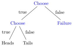 First, we make a choice between true and false, if we get true then we evaluate our toss-computation from before, otherwise we fail. Figure 2 depicts the computation tree for drunkToss.